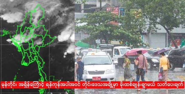 မိုးလေဝသပညာရှင် စုစုစံကတော့ နောက် ၂၄ နာရီအတွင်း ကော့ကရိတ်၊ သင်္ကန်းညီနောင်၊ မြဝတီတို့မှာ မိုးများစွာ ရွာသွန်းနိုင်သလို ပဲခူးတိုင်းမှာတော့ ဇူလိုင် ၁၉ ရက်မှ ၂၂ ရက်နေ့အထိ၊ ရန်ကုန်တိုင်းမှာတော့ ဇူလိုင် ၂၀ ရက်မှ ၂၂ ရက်အတွင်း တိုင်းတတိုင်းလုံး မိုးများစွာ ရွာသွန်းနိုင်တဲ့အတွက် ဒီရေတက်ချိန်၊ မိုးကြီးချိန် သတိပြုဖို့လိုအပ်တယ်လို့ ဆိုပါတယ်။