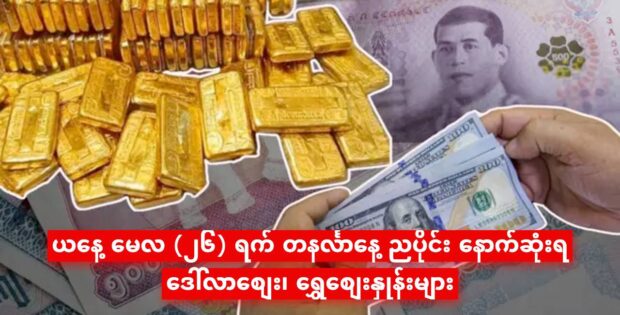 ယနေ့ မေလ (၂၆) ရက် တနင်္လာနေ့ ညပိုင်း နောက်ဆုံးရ ဒေါ်လာစျေး၊ ရွှေစျေးနှုန်းများ
