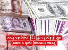 ထိုင်းဘတ်အပါအဝင် အာရှငွေစျေးတွေ အတက်ပြနေပါတယ်။ ယနေ့ နိုင်ငံခြားငွေလဲနှုန်းများ (မေလ ၆ ရက်) -အမေရိကန်ဒေါ်လာ ရောင်းဈေး – ၄၄၁၀ ကျပ် ဝယ်ဈေး – ၄၃၆၀ ကျပ် -ယူရို ရောင်းဈေး – ၄၉၉၅ ကျပ် ဝယ်ဈေး – ၄၈၉၅ ကျပ် -မလေးရှားရင်းဂစ် ရောင်းဈေး