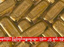 ကမ္ဘာ့ရွှေစျေး ပြန်ကျနေပြီး ပြည်တွင်းရွှေစျေးဟာလည်း ကျပ် သိန်း ၈၀ အောက်ထံ ပြန်ရောက်လာနေပါတယ်။ ယနေ့ ပြည်တွင်းရွှေဈေး (ဇွန်လ ၂၅ ရက်) -ကမ္ဘာ့ရွှေဈေး တအောင်စ ၃၃၂၈ ဒေါ်လာ ဓာတ်သတ္တု(ရွှေ)ရည်ညွှန်းစျေး – အကယ်ဒမီ မီးလင်းရွှေ တကျပ်သား ၅၈၉၀၀၀၀ ကျပ် စနစ်ဟောင်း (၁ိ – ၁၆.၆၀၆