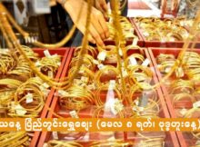 ယနေ့ ရွှေဈေး (မေလ ၈ ရက်၊ ဗုဒ္ဓဟူးနေ့ နံနက် ၁၀ နာရီ) -ကမ္ဘာ့ရွှေဈေး တအောင်စ ၂၃၁၄ ဒေါ်လာ -အခေါက်ရွှေ တကျပ်သား (ပြင်ပဈေးကွက်) ရောင်းဈေး ၄၇၆၀၀၀၀ ကျပ် ဝယ်ဈေး ၄၇၂၀၀၀၀ ကျပ် -၁၅ ပဲရည် တကျပ်သား ရောင်းဈေး ၄၅၆၀၀၀၀ ကျပ်
