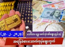 ယနေ့ ဖေဖော်ဝါရီလ (၂၄) ရက်၊ စနေနေ့ ညနေ ၅ နာရီ ဝန်းကျင် အရ ငွေလဲနှုန်း ၊ ရွှေဈေးနှုန်း ၊ စက်သုံးဆီဈေးနှုန်း ၊ ဆန်ဈေးနှုန်း များမှာ အောက်ပါအတိုင်းဖြစ်ပါတယ်။ မှတ်ချက်။ ။ ဆန်စျေးများမှာ ကုန်သည်ကြီးများအသင်းမှ စျေးဖြစ်သည့်အတွက် နေရာဒေသပေါ်မူတည်၍ ကွဲလွဲမှုရှိပါသည်။ ရွှေစျေးနှင့် စက်သုံးဆီစျေးများသည်လည်း